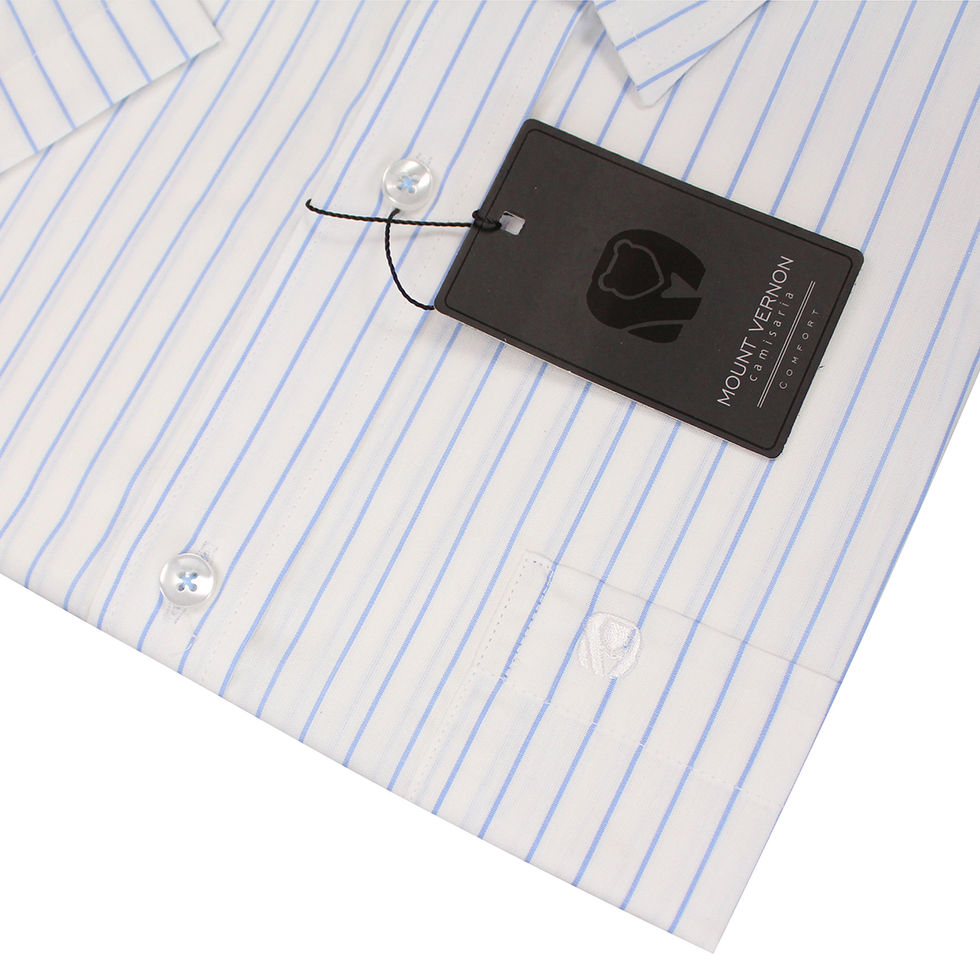 Descrição: A Camisa Comfort é a escolha ideal para quem busca estilo sem abrir mão do conforto em dias mais quentes. Seu tecido Tricoline Listrado, 100% Algodão - Fio 50, tem um toque macio incomparável. Com modelagem de manga curta e padronagem clássica de listras finas verticais, ela é versátil e fresca. Apresenta colarinho com aleta, bolso no peito com bordado exclusivo e vista americana. Detalhes como o viés contrastante no pé de gola elevam o design da peça.